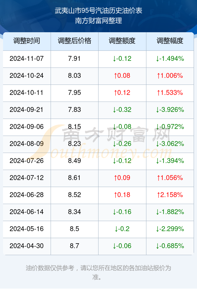 武夷山市95号汽油历史油价表