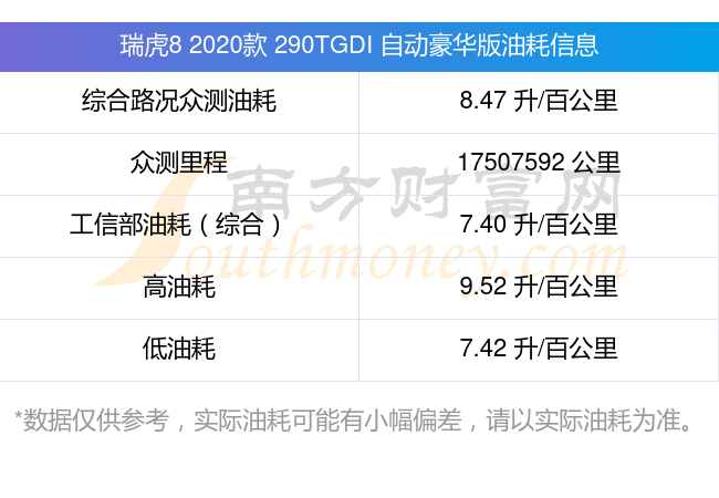 根据车主实测数据,该车型低油耗为7.42L/100km,高油耗为9.52L/100km,综合路况众测油耗为8.47L/100km,工信部综合油耗为7.40L/100km。
