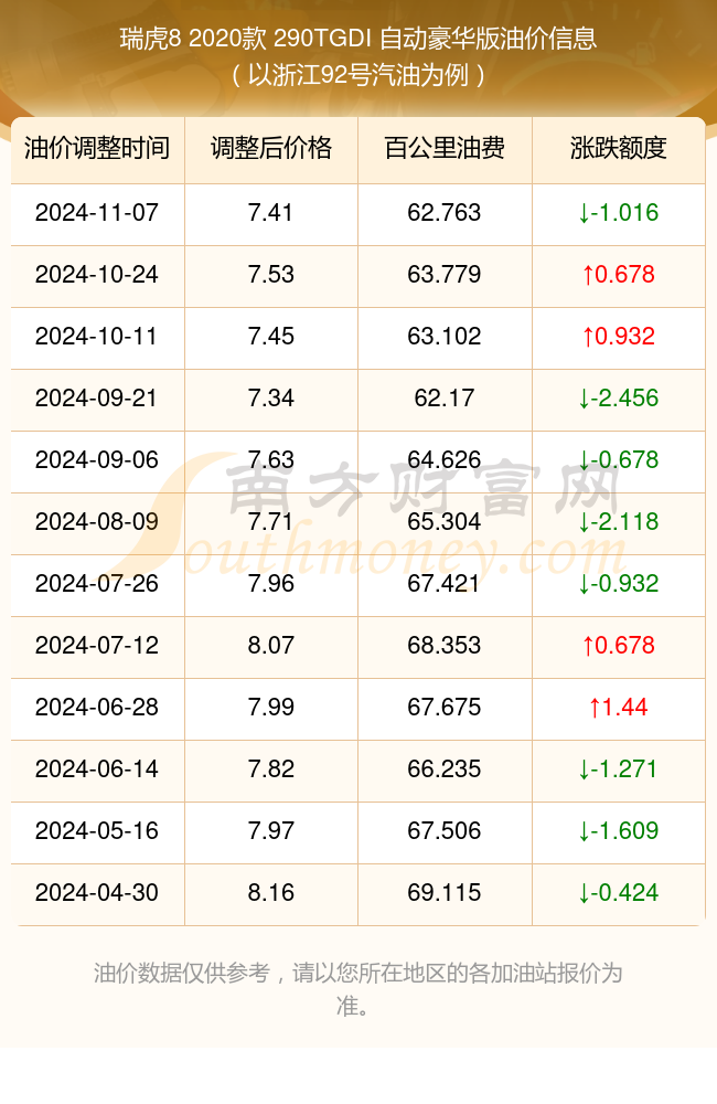 根据11月7日92号汽油最新调整价格7.41元/升来计算(以浙江为例),该车型每百公里的平均油费是62.763元,上一轮10月24日调整价格7.53元每升来计算,每百公里的平均油费是63.779元,对比上一轮少花1.016元,下一轮的油价调整时间是12月2日24时。