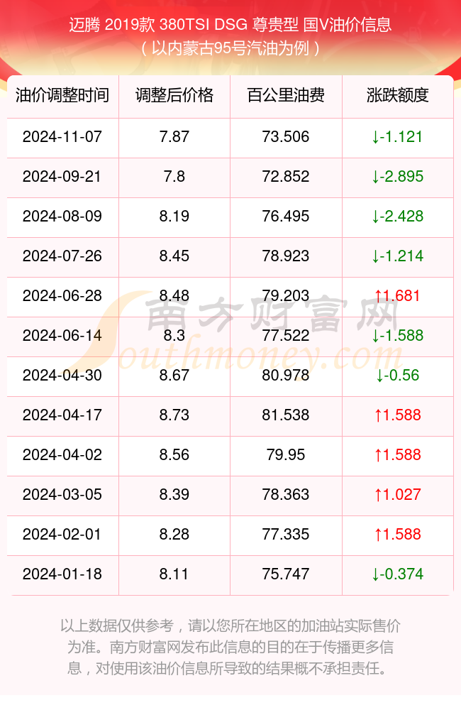 按照11月7日95号汽油最新调整价格7.87元/升来计算(以内蒙古为例),该车型百公里平均油费为73.506元,按照上一轮9月21日调整价格7.99元/升来计算,百公里平均油费为74.627元,对比上一轮少花1.121元,下一轮油价调整时间为12月2日24时。