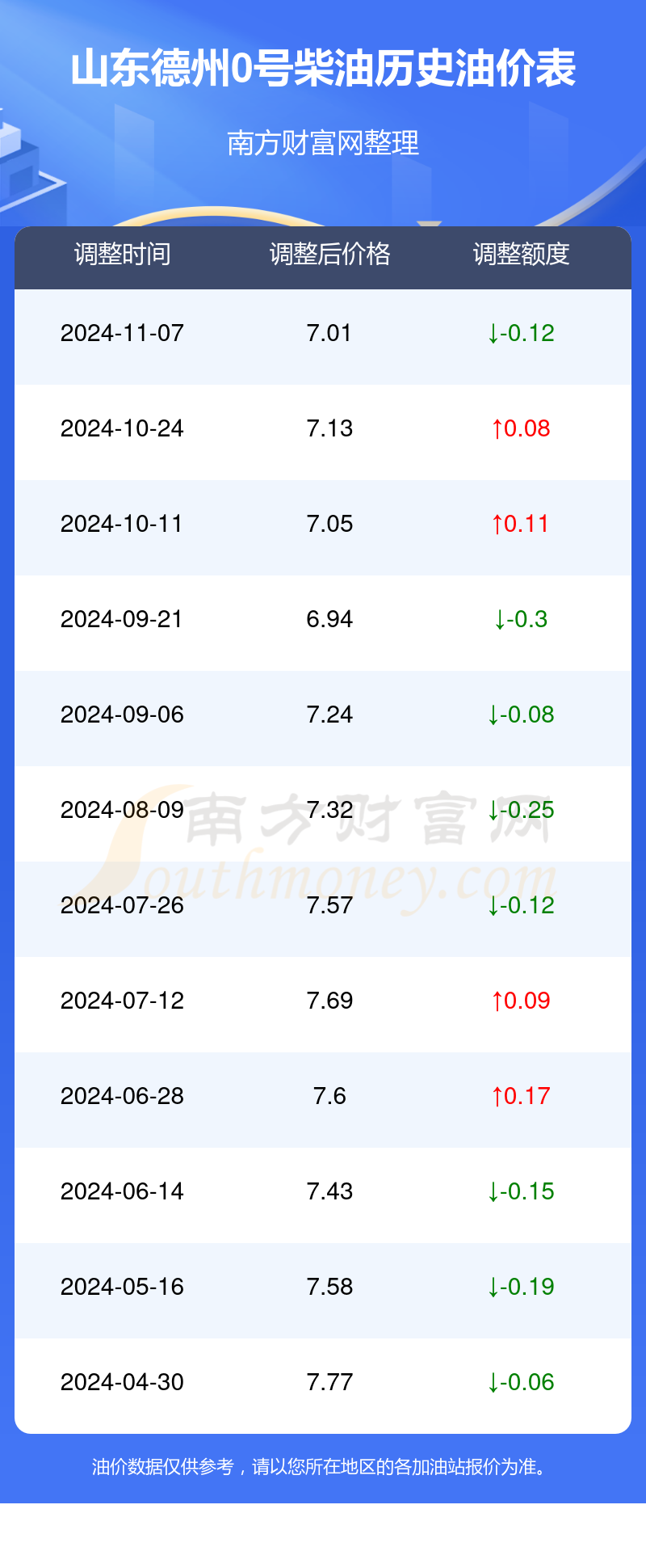 11月26日山东德州0号柴油的价格为11月7日油价调整后的价格,每升7.01元,对比上一轮油价调整时间10月24日的价格7.13元每升,下调了0.12元,下调幅达1.683%。