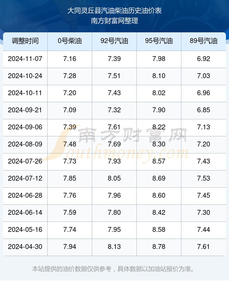 大同灵丘县汽油、柴油11月26日每升的价格为11月7日调整后的价格,具体油价为:92号汽油7.39元;95号汽油7.98元;89号汽油6.92元;0号柴油7.16元。
