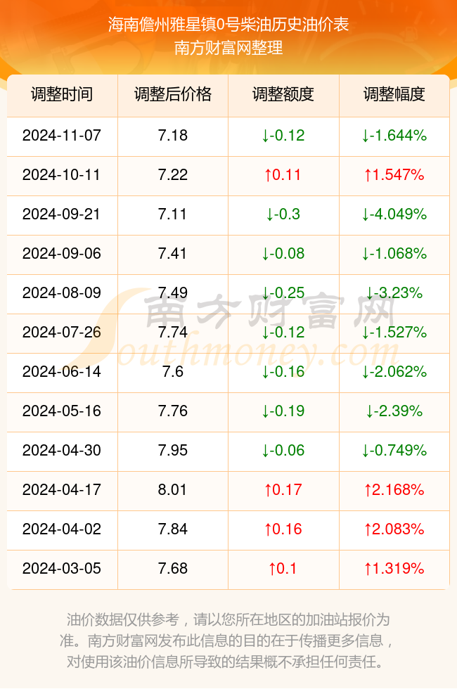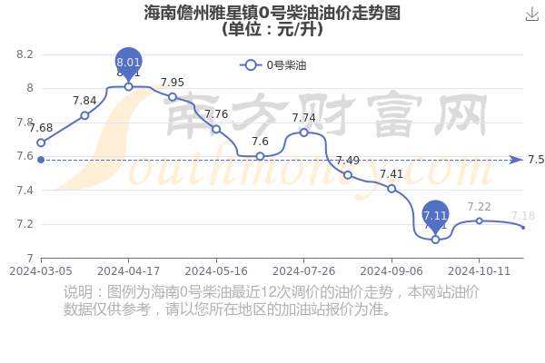 11月26日,海南儋州雅星镇0号柴油价格为每升7.18元,这是11月7日油价调整后的价格,相对上次调整时间10月11日的油价7.3元每升,下降了0.12元,下降1.644%。