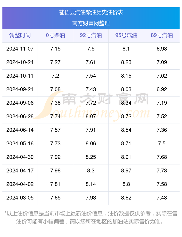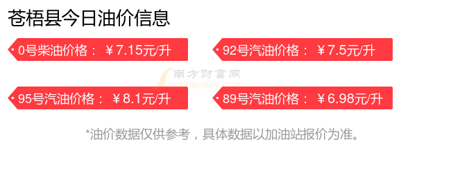 11月26日苍梧县汽油、柴油每升价格详情为:92号汽油为7.5元,跌了0.11元;95号汽油为8.1元,跌了0.13元;89号汽油为6.98元,跌了0.11元;0号柴油为7.15元,跌了0.12元,本次油价调整时间为11月7日。