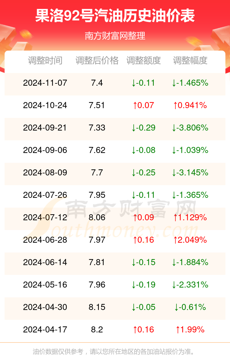 11月26日果洛92号汽油的价格为7.4元/升,为11月7日油价调整后的价格,相对上次调整下降了0.11元,下降1.465%。