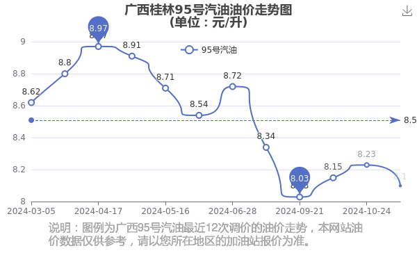 11月26日广西桂林95号汽油的价格为11月7日调整后的价格,具体为:8.1元每升,相对上次调整时间10月24日的油价8.23元每升,下降了0.13元,下降幅达1.58%。
