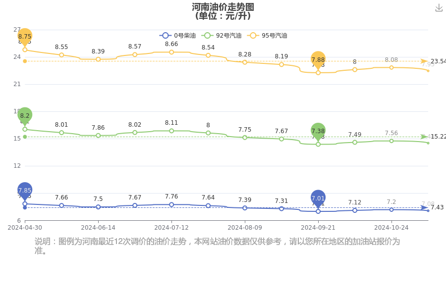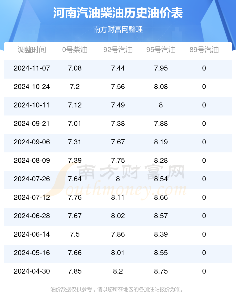 11月26日河南汽油、柴油每升的价格具体为:本轮油价调整时间为11月7日,92号汽油是7.44元,下调了0.12元,下调幅达1.59%;95号汽油是7.95元,下调了0.13元,下调幅达1.61%;0号柴油为7.08元,下调了0.12元,下调幅达1.67%。