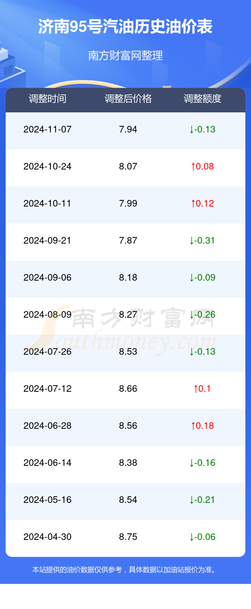 11月26日济南95号汽油的价格为7.94元/升,这是11月7日调整后的价格,相对上次调整时间10月24日的油价8.07元每升,下跌了0.13元,下跌幅达1.611%。