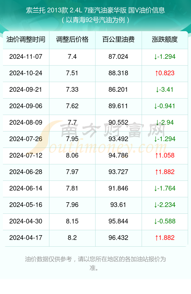 根据11月7日92号汽油最新调整价格7.4元/升来计算(以青海为例),该车型每百公里的平均油费是87.024元,上一轮10月24日调整价格7.51元每升来计算,每百公里的平均油费是88.318元,对比上一轮少花1.294元,下一轮的油价调整时间是12月2日24时。