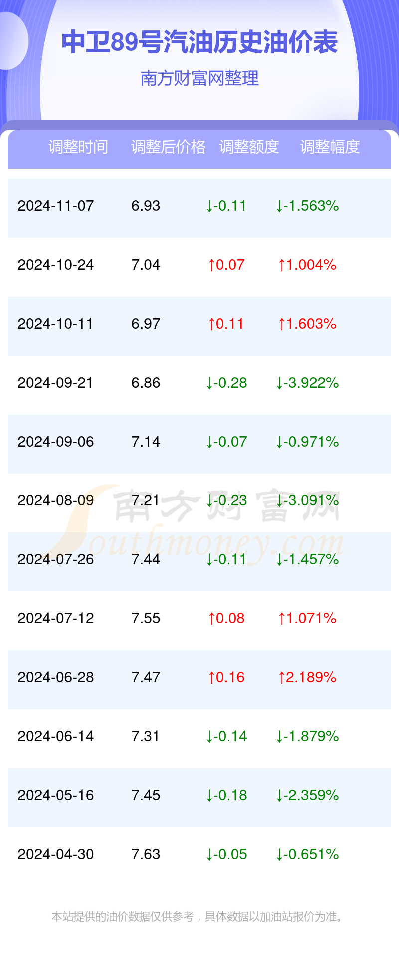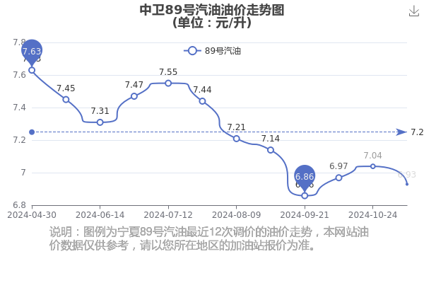 11月26日中卫89号汽油的价格是6.93元/升(油价调整时间11月7日),相对上一轮油价调整时间10月24日的价格7.04元/升,降了0.11元,降幅达1.563%。