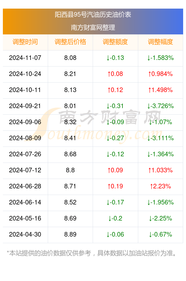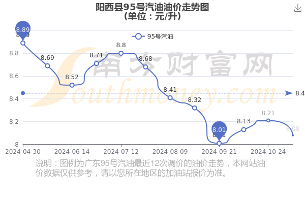 11月26日阳西县95号汽油的价格是8.08元/升,油价于11月7日调整,相对上次调整时间10月24日的油价8.21元每升,共下调了0.13元,下调幅达1.583%。