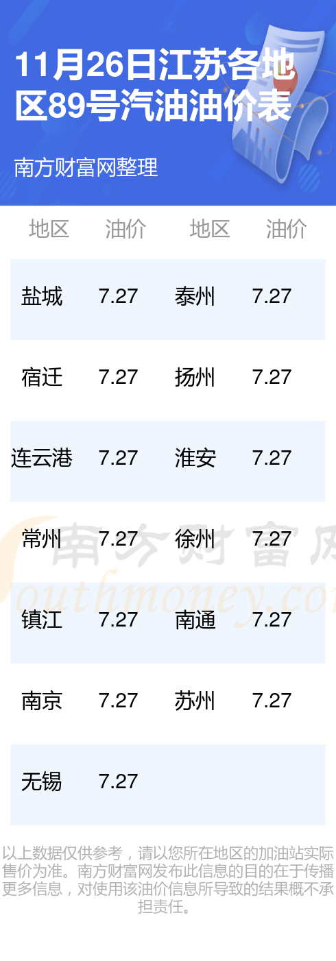 江苏89号汽油11月26日的最新油价是6.95元/升,本轮油价调整时间是11月7日,对比上次共减了0.1元,减1.418%。