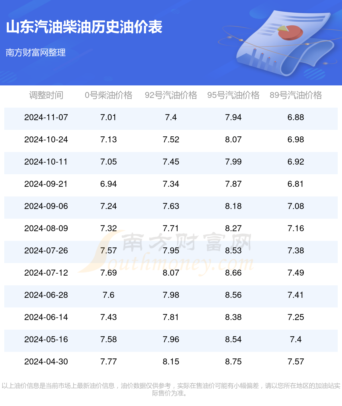 山东汽油、柴油11月27日每升的价格是多少?具体为:92号汽油为7.4元;95号汽油为7.94元;89号汽油为6.88元,下调了0.1;0号柴油为7.01元,本轮调整时间为11月7日。