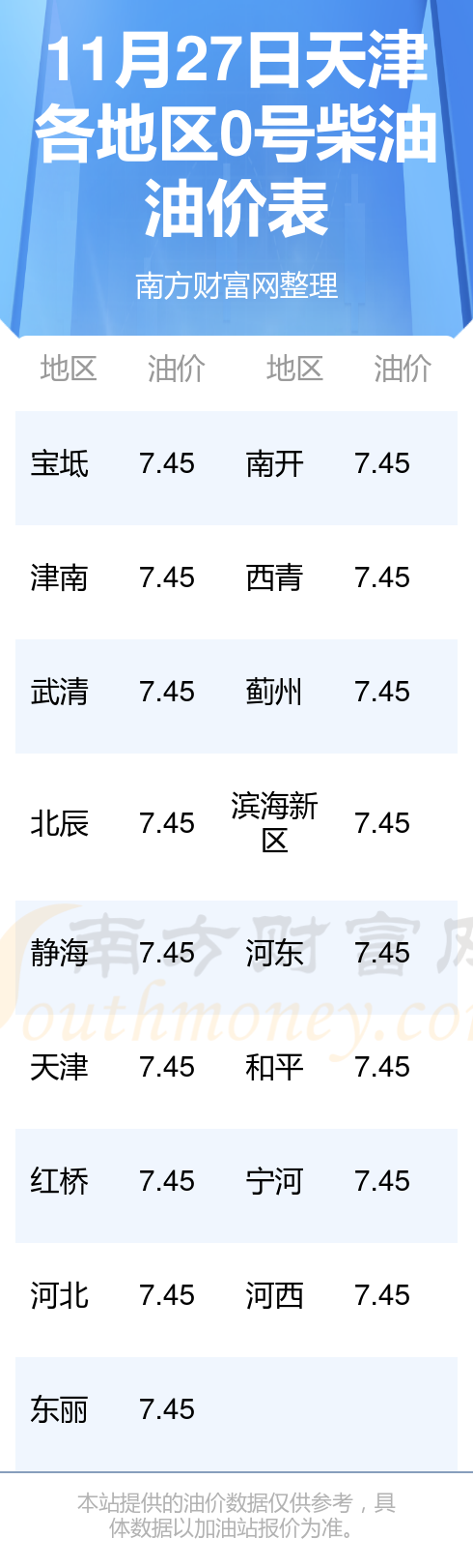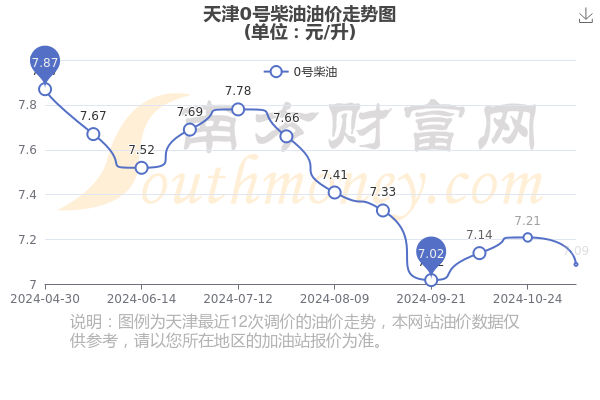 11月27日,天津0号柴油的价格是11月7日调整后的价格,为7.09元每升,对比上一轮油价调整共降了0.12元。