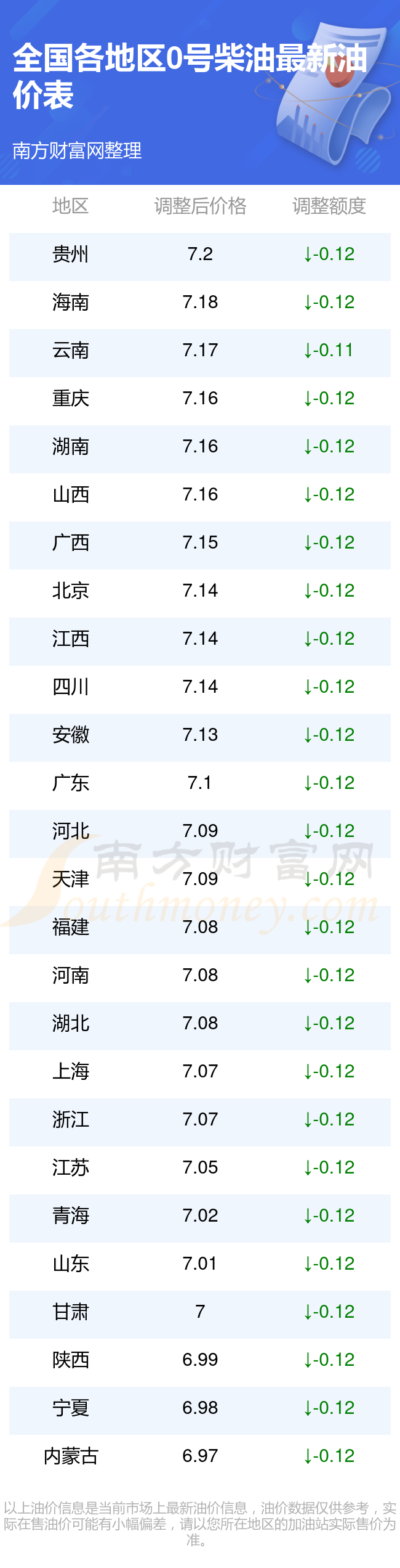 全国0号柴油11月27日的价格多少钱一升?11月7日油价调整后,详情如下:平均价格为7元/升,最低的是内蒙古,价格6.97元/升,最高的是贵州,价格7.20元/升。