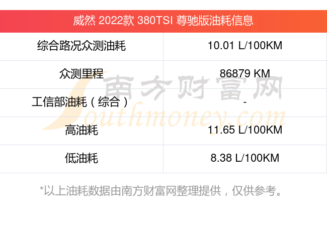 根据多位车主实测得出数据,该车型低油耗为8.38L/100km,高油耗为11.65L/100km,综合路况众测油耗为10.01L/100km,工信部综合油耗为-L/100km。