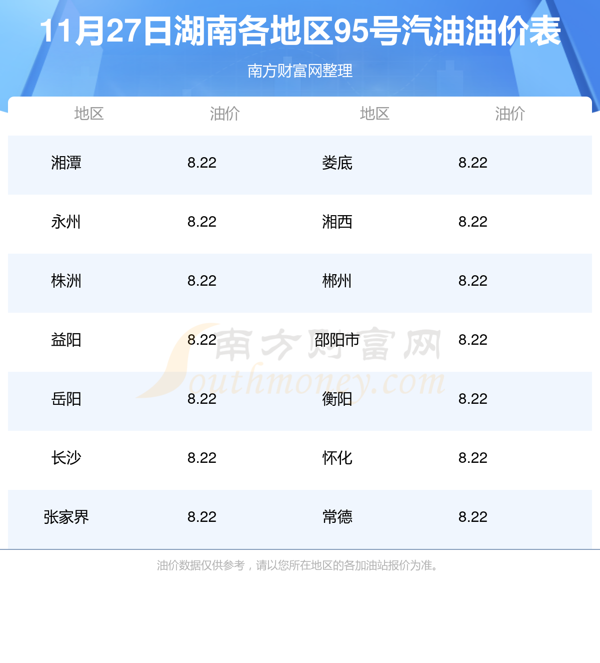 11月27日,湖南95号汽油价格为7.86元/升,本轮调整时间为11月7日,相对上次调整后10月24日的油价7.98元每升,下调了0.12元,下调幅达1.536%。
