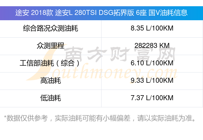 根据多位车主实测得出数据,该车型低油耗为7.37升每百公里,高油耗为9.33升每百公里,综合路况众测油耗为8.35升每百公里,工信部综合油耗为6.10升每百公里。