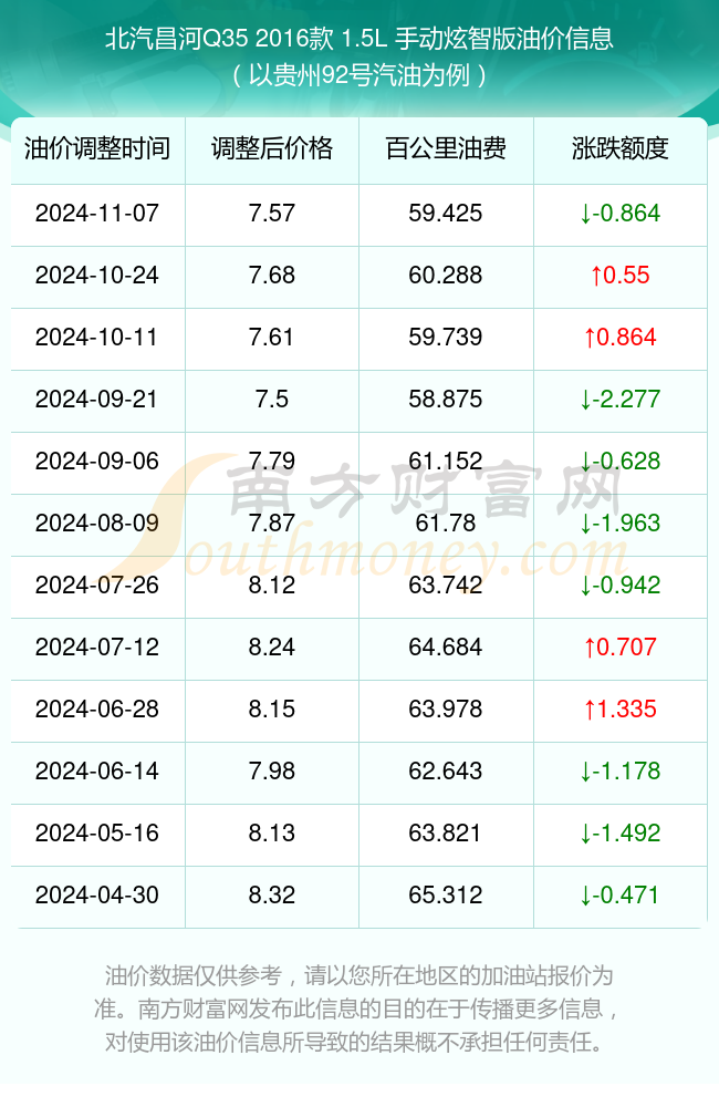 根据11月7日92号汽油最新调整价格7.57元/升来计算(以贵州为例),该车型每百公里的平均油费是59.425元,上一轮10月24日调整价格7.68元每升来计算,每百公里的平均油费是60.288元,对比上一轮少花0.864元,下一轮的油价调整时间是12月2日24时。