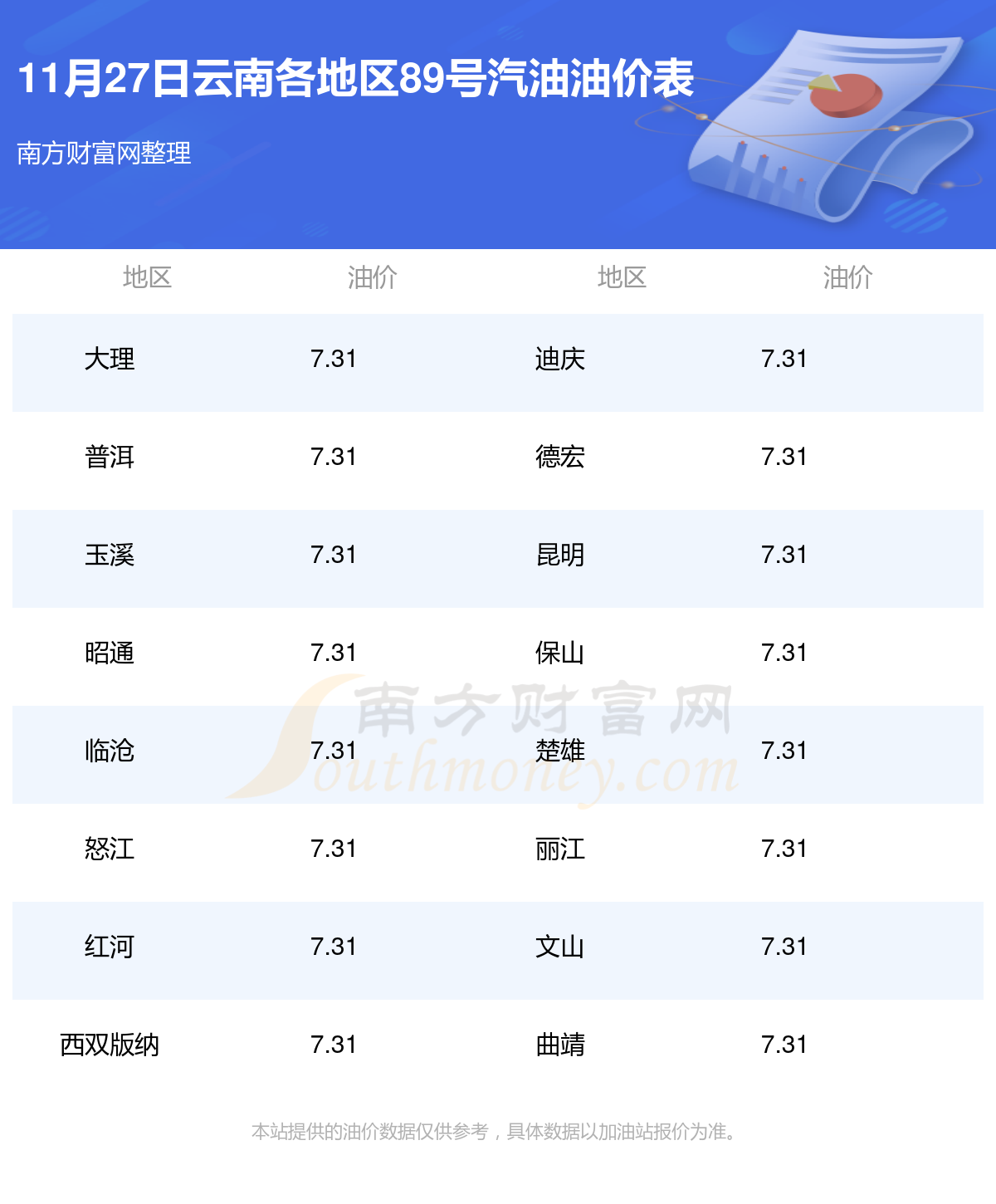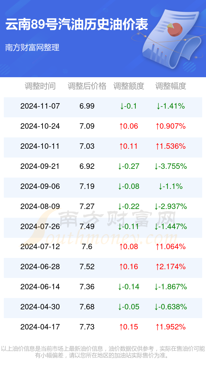 云南89号汽油11月27日价格为6.99元/升,调整时间为11月7日,相对上次跌了0.1元,跌1.41%。
