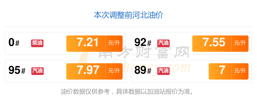 11月27日,河北汽油、柴油每升最新价格为:92号汽油为7.43元,下调了0.12元;95号汽油为7.85元,下调了0.12元;89号汽油为6.89元,下调了0.11;0号柴油为7.09元,下调了0.12元,调整时间为11月7日。