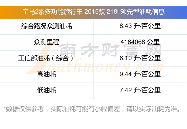 根据多位车主实测得出数据,该车型低油耗为7.42升/百公里,高油耗为9.44升/百公里,综合路况众测油耗为8.43升/百公里,工信部综合油耗为6.10升/百公里。