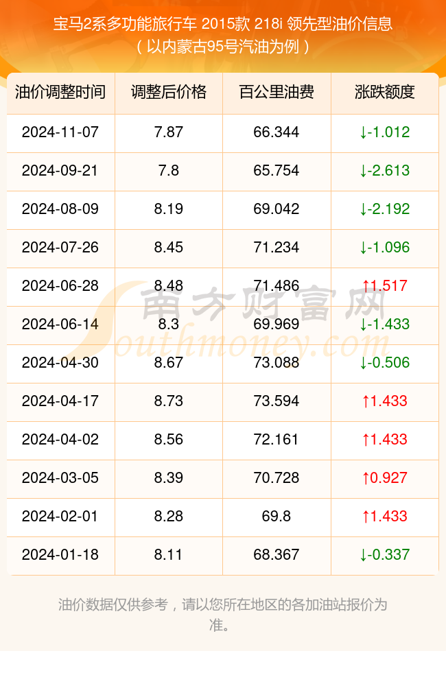 依照11月7日95号汽油最新调整价格7.87元/升来计算(以内蒙古为例),该车型百公里的平均油费是66.344元,依照上一轮9月21日调整价格7.99元/升来计算,百公里的平均油费是67.356元,对比上一轮少花1.012元,下一轮的油价调整时间12月2日24时。