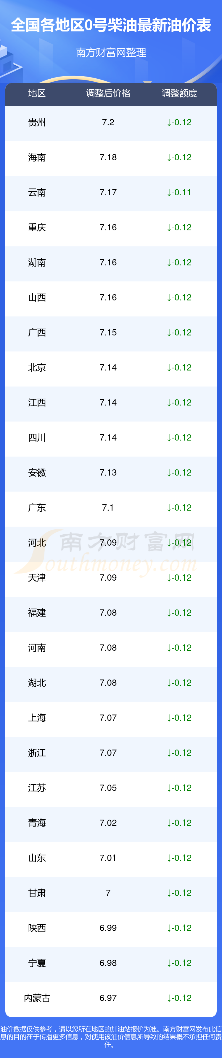 11月27日全国0号柴油每升的价格是多少?具体如下:11月7日油价调整后,平均价格为7元/升,最低的是内蒙古,价格6.97元/升,最高的是贵州,价格7.20元/升。