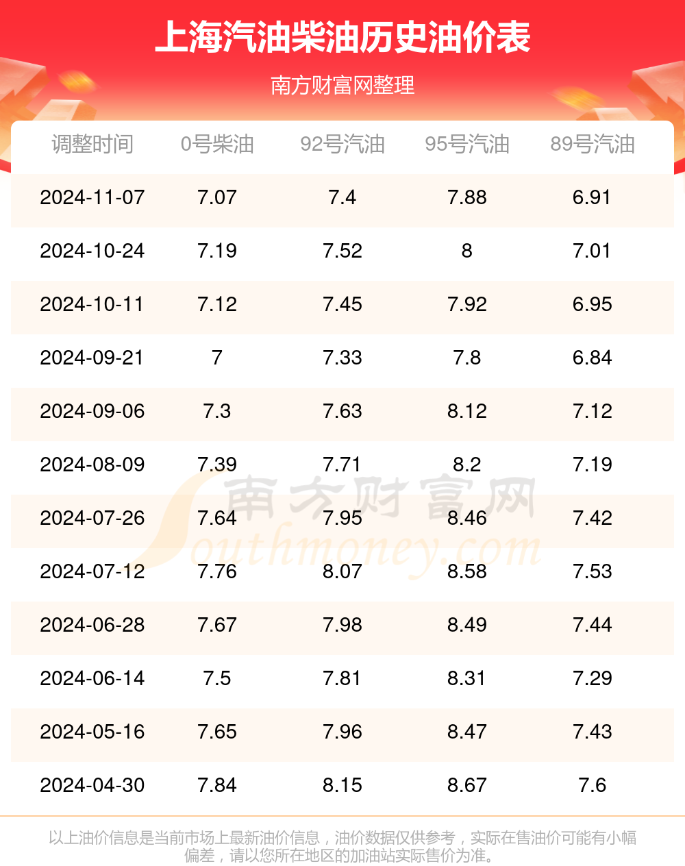 上海汽油、柴油11月27日每升最新价格为11月7日调整后的价格,92号汽油为7.4元,下调了0.12元;95号汽油为7.88元,下调了0.12元;89号汽油为6.91元,下调了0.1;0号柴油为7.07元,下调了0.12元。