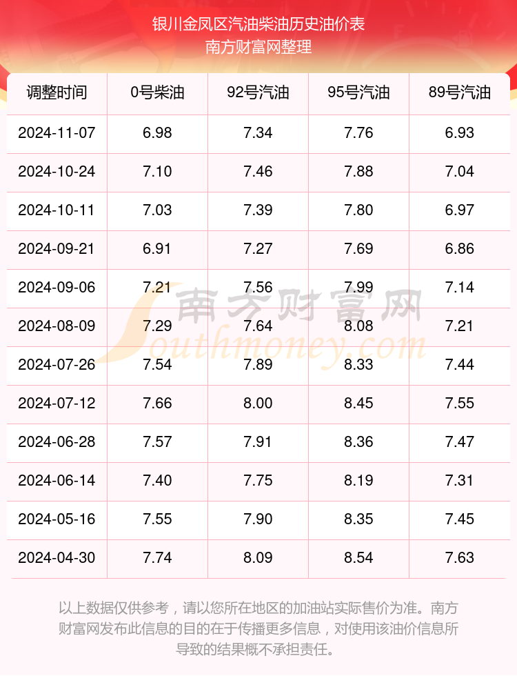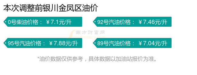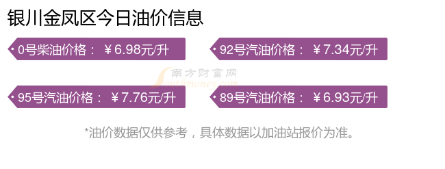 11月27日银川金凤区汽油、柴油价格是多少钱一升?11月7日调整后,92号汽油为7.34元,降了0.12元,降幅达1.61%;95号汽油为7.76元,降了0.12元,降幅达1.52%;89号汽油为6.93元,降了0.11元,降幅达1.56%;0号柴油为6.98元,降了0.12元,降幅达1.69%。