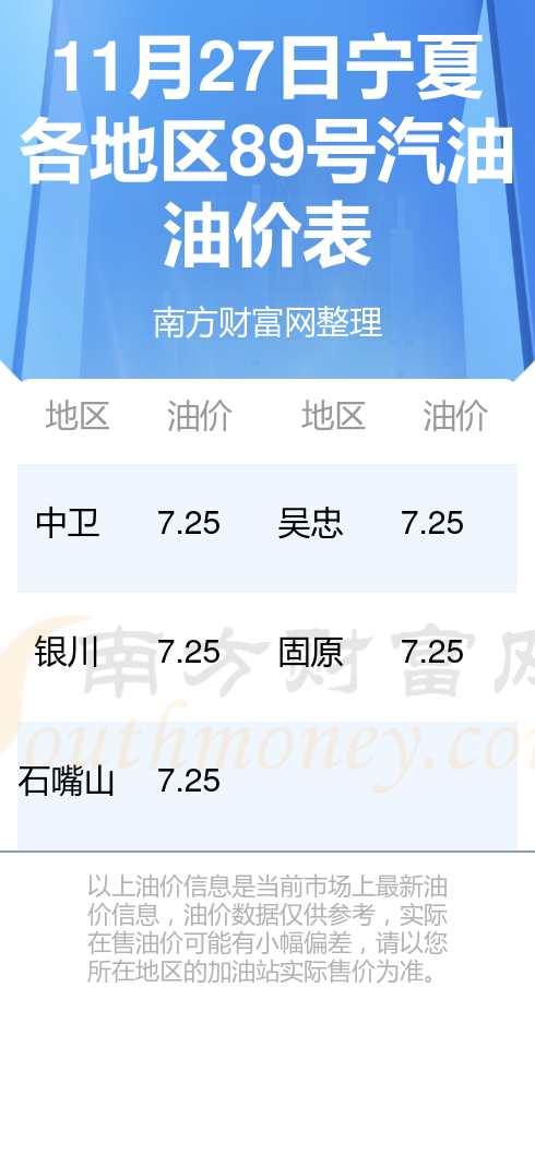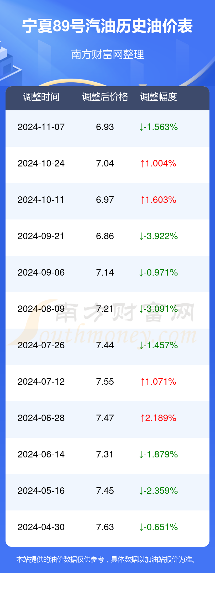 11月27日宁夏89号汽油的价格是11月7日调整后的价格,为6.93元/升,10月24日为上一轮油价调整时间,上次调整后宁夏89号汽油价格为7.04元/升,本次相比下跌了0.11元,下跌幅为1.563%。