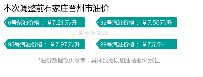 石家庄晋州市汽油、柴油11月27日每升的价格为:92号汽油7.43元;95号汽油7.85元;89号汽油6.89元;0号柴油7.09元,本次油价调整时间是11月7日。