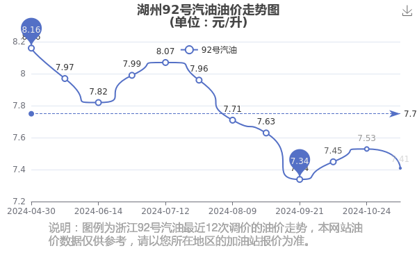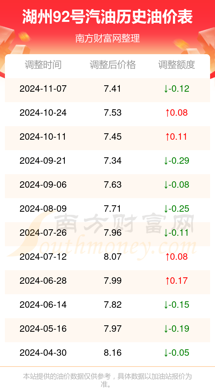 湖州92号汽油11月27日最新价格为7.41元每升,本轮油价调整时间为11月7日,相对上次调整时间10月24日的油价7.53元每升,共下调了0.12元,下调1.594%。