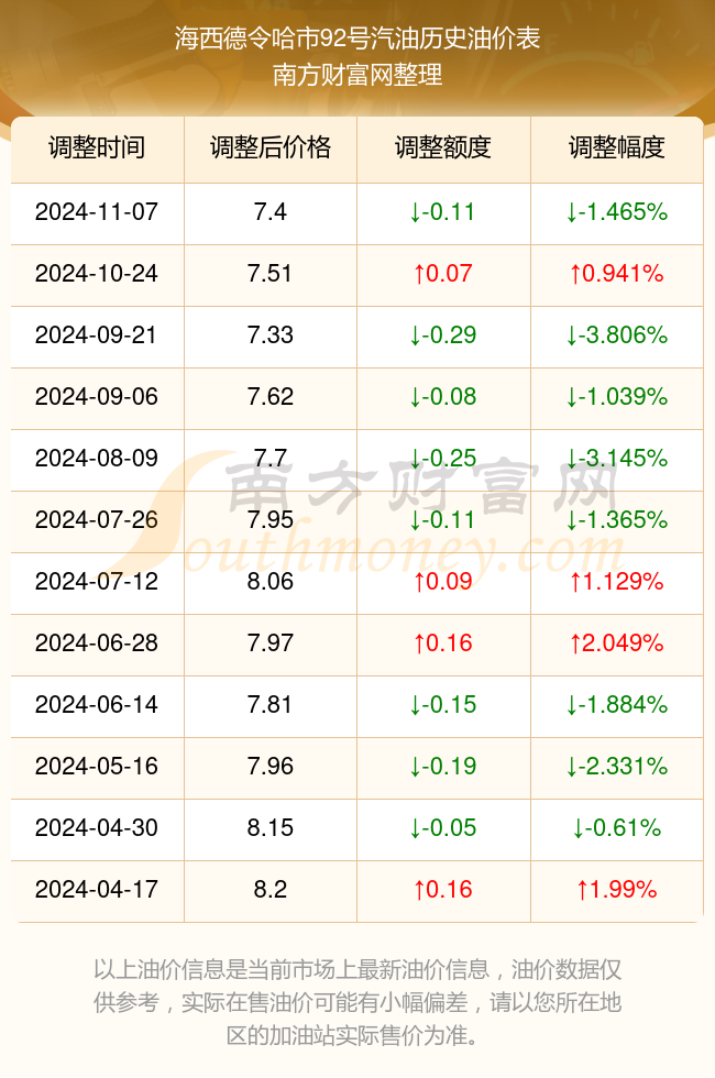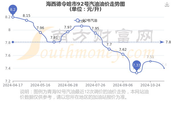 海西德令哈市92号汽油11月27日最新价格为7.4元每升,本轮油价调整时间为11月7日,相对上次调整时间10月24日的油价7.51元每升,共下调了0.11元,下调1.465%。