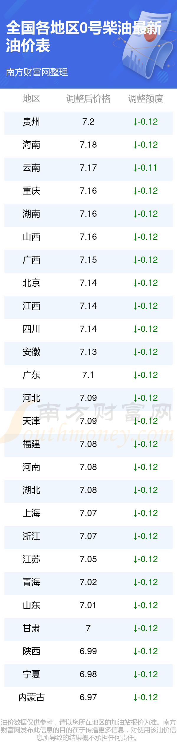 全国0号柴油11月27日的最新价格是11月7日油价调整后的价格,详情如下:平均价格为7元/升,最低的是内蒙古,价格6.97元/升,最高的是贵州,价格7.20元/升。