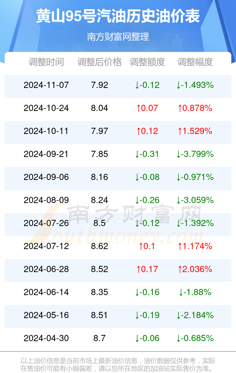 11月27日,黄山95号汽油今日价格(调整时间为11月7日):7.92元每升,对比上次调整(10月24日)的油价8.04元每升,共减了0.12元,减幅达1.493%。