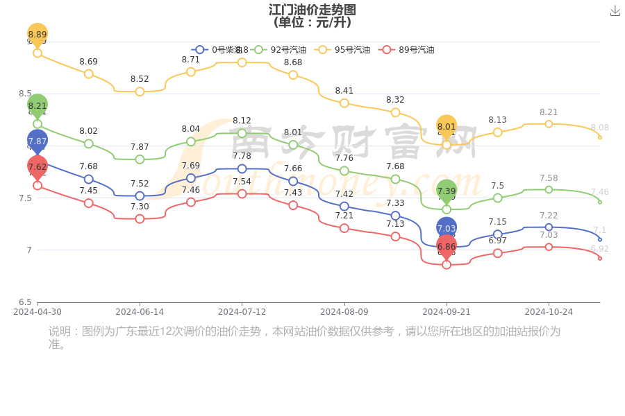 11月27日,江门汽油、柴油每升最新价格:本轮的油价调整时间是11月7日,92号汽油为7.46元,下调了0.12元,下调幅达1.58%;95号汽油为8.08元,下调了0.13元,下调幅达1.58%;89号汽油为6.92元,下调了0.11元,下调幅达1.57%;0号柴油为7.1元,下调了0.12元,下调幅达1.66%。