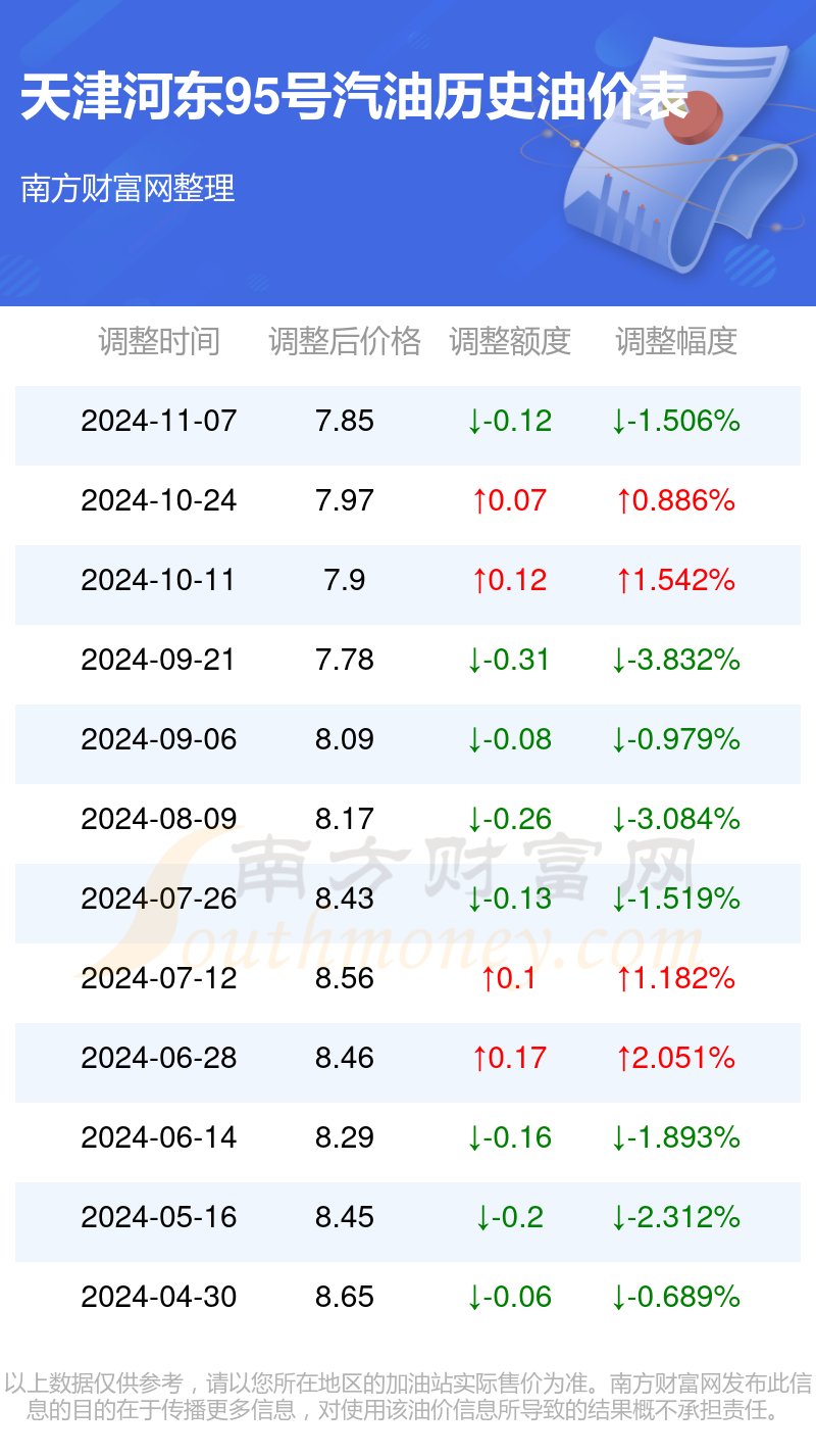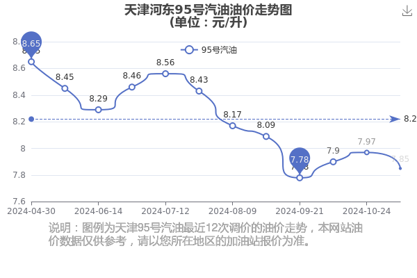 11月27日天津河东95号汽油价格:7.85元每升,调整时间为11月7日,相对上次调整下降了0.12元。