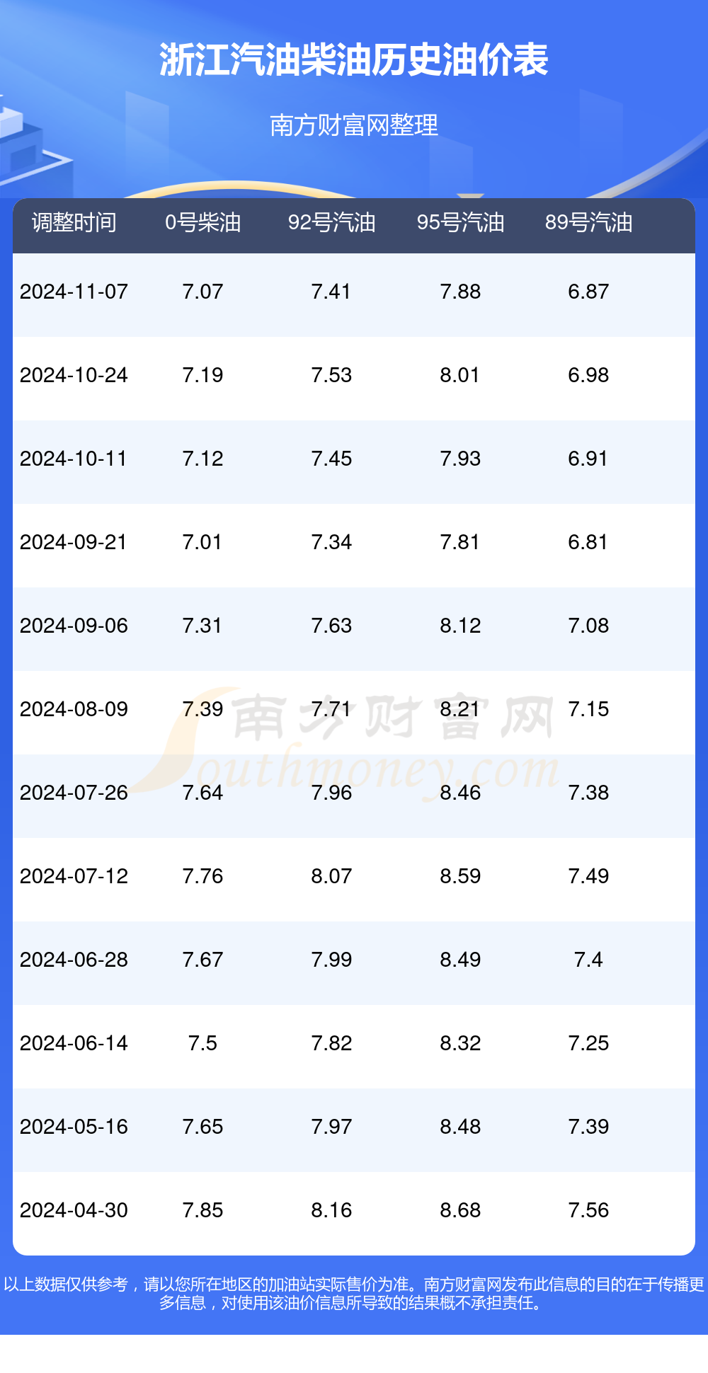 11月27日浙江汽油、柴油每升的最新价格:92号汽油7.41元;95号汽油7.88元;89号汽油6.87元,下调了0.11;0号柴油7.07元,本轮油价的调整时间是11月7日。
