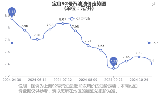 11月27日宝山92号汽油的价格是7.4元/升,油价于11月7日调整,相对上次调整时间10月24日的油价7.52元每升,共下跌了0.12元,下跌幅达1.596%。