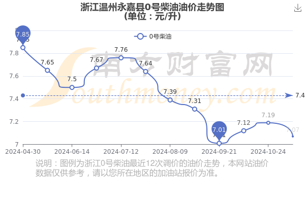 11月27日浙江温州永嘉县0号柴油的价格是7.07元/升(调整时间为11月7日),对比上次调整时间10月24日的油价7.19元/升,下跌了0.12元,下跌幅达1.669%。