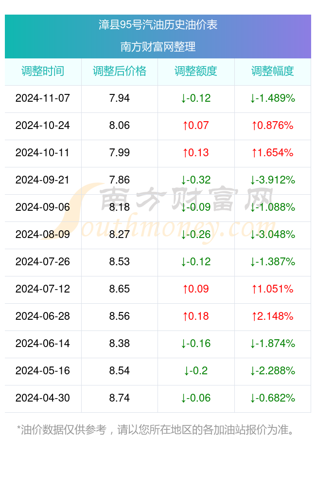 11月27日,漳县95号汽油价格为每升7.94元,这是11月7日油价调整后的价格,相对上次调整时间10月24日的油价8.06元每升,降了0.12元,降1.489%。