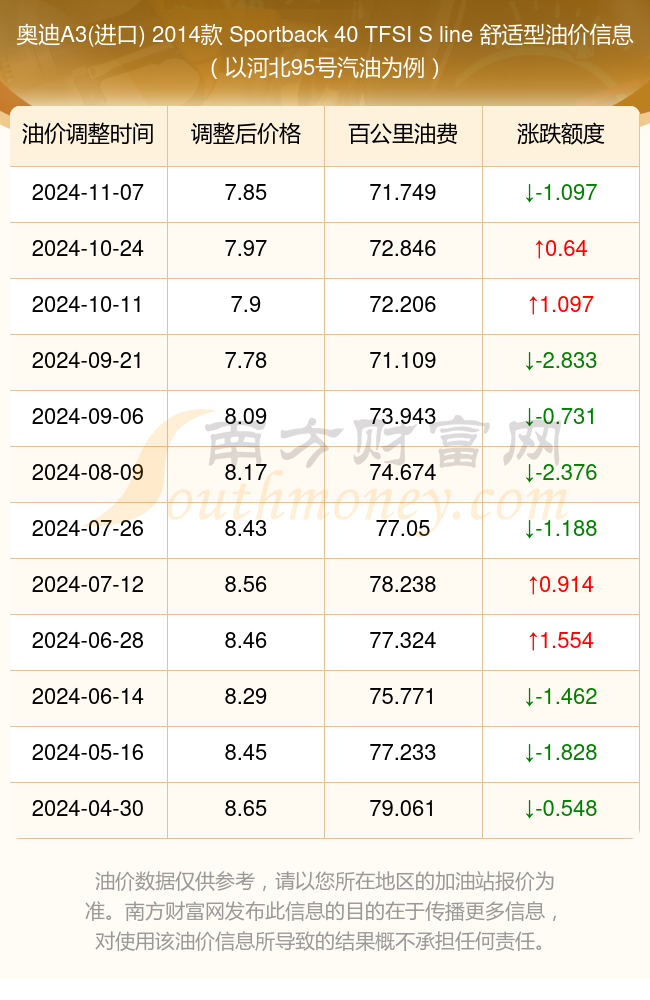 按11月7日95号汽油最新调整价格7.85元每升来计算(以河北为例),该车型百公里平均油费为71.749元,按上一轮10月24日调整价格7.97元每升来计算,百公里平均油费为72.846元,对比上一轮少花1.097元,下一轮油价调整时间为12月2日24时。