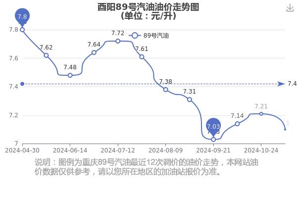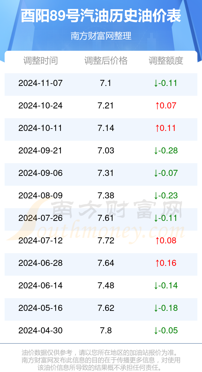 11月27日酉阳89号汽油的价格为7.1元每升,本次调整时间为11月7日,相对上次调整时间10月24日的油价7.21元每升,跌了0.11元,跌幅达1.526%。