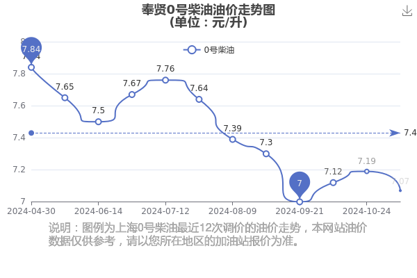 11月27日奉贤0号柴油价格查询:每升7.07元(11月7日油价调整后的价格),相对上次调整时间10月24日的油价7.19元每升,下跌了0.12元,下跌1.669%。