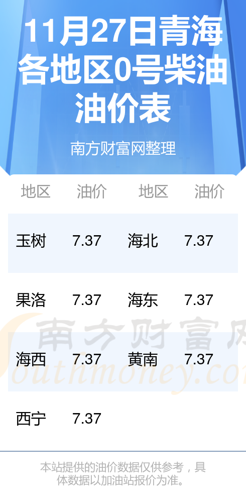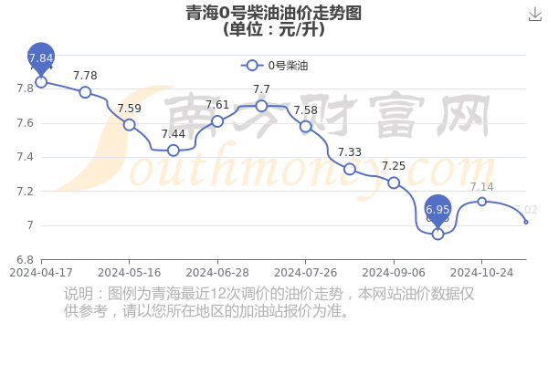 11月27日,青海0号柴油最新油价是7.02元每升,本轮调整时间为11月7日,相对上轮调整时间10月24日的油价7.14元/升,下跌了0.12元。