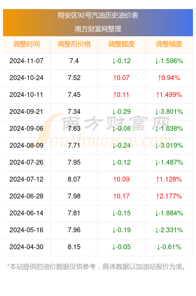 翔安区92号汽油11月27日的最新价格(11月7日油价调整后的价格):翔安区92号汽油7.4元/升,相对上次调整时间10月24日的油价7.52元每升,降了0.12元,降1.596%。
