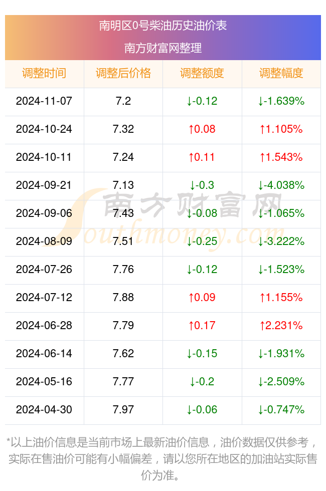 11月27日南明区0号柴油的价格为7.2元/升,这是11月7日调整后的价格,相对上次调整时间10月24日的油价7.32元每升,跌了0.12元,跌幅达1.639%。