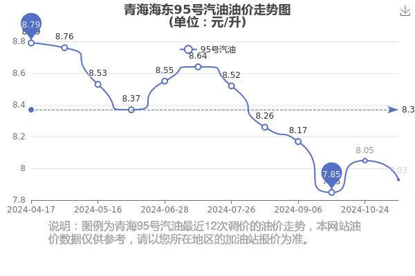 青海海东95号汽油11月27日价格(11月7日调整后的价格):7.93元每升,对比上次调整(10月24日)的价格8.05元每升减了0.12元,减幅达1.491%。
