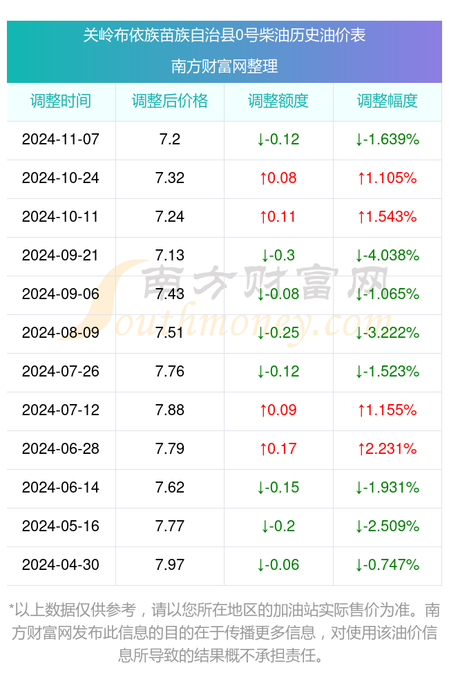 11月27日关岭布依族苗族自治县0号柴油的最新价格(11月7日调整后的价格):7.2元/升,相对上次调整下降了0.12元。